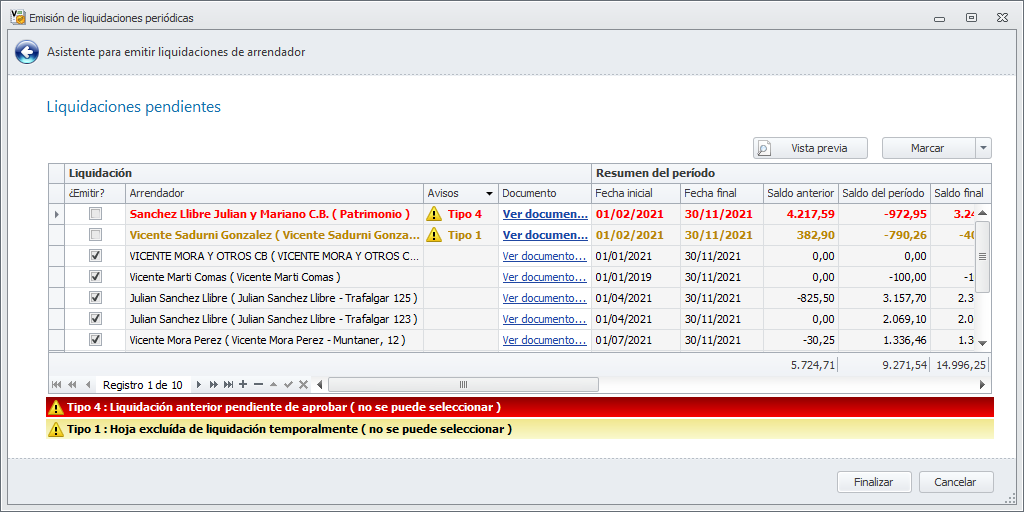 El proceso de emisión de liquidaciones incorpora un método de notificación de incidencias para ayudar al usuario a conocer el motivo por el que algunas liquidaciones no se van a poder emitir.