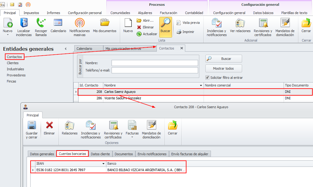En la ficha de contacto se extraen las cuentas bancarias de la pestaña “Datos cliente” y se sitúan en una pestaña independiente