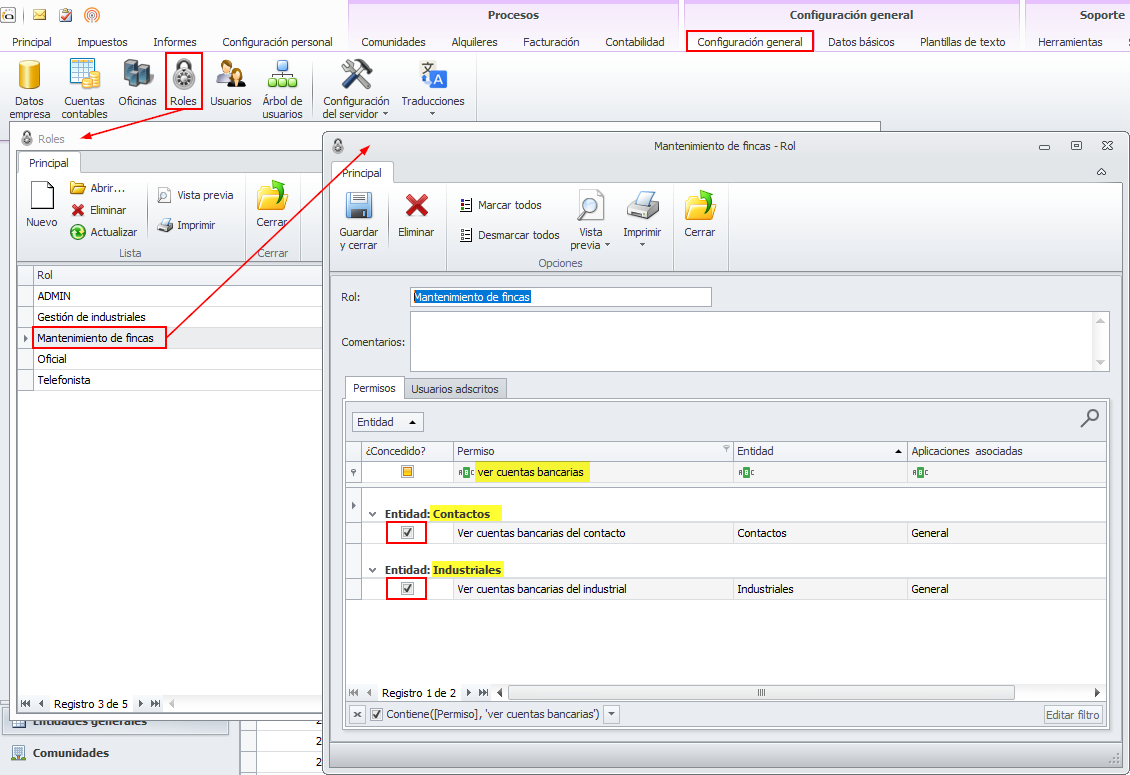 Se ha creado un nuevo permiso, vinculado a las entidades contactos e industriales para permitir ver u ocultar la pestaña “Cuentas bancarias”.