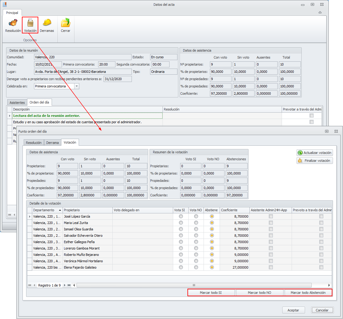 Se ha modificado el proceso Introducción de datos de la reunión, para añadir nuevos botones a la ventana que gestiona la votación. Éstos permiten asignar el voto “Sí”, “No” o “Abstención” a todos los asistentes de una sola vez.