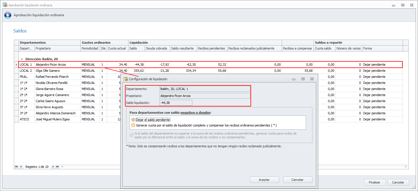 Al aprobar una liquidación, la ventana en la que se cambia el tratamiento de los saldos individuales incorpora datos del departamento activo