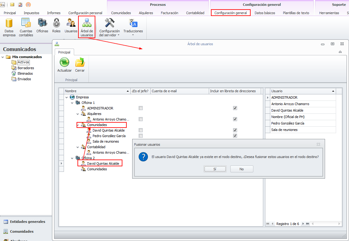 Al mover un usuario a un departamento en el que ya está dado de alta, se fusiona la información del usuario en el departamento de destino