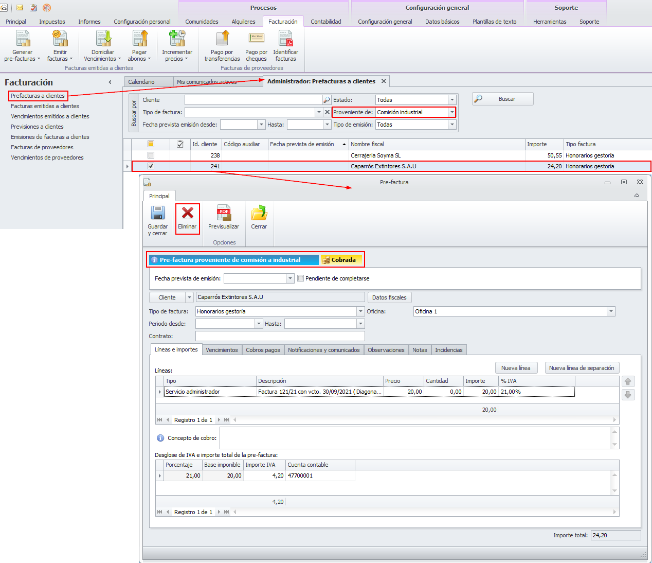 Se permite eliminar prefacturas de comisión con cobro registrado