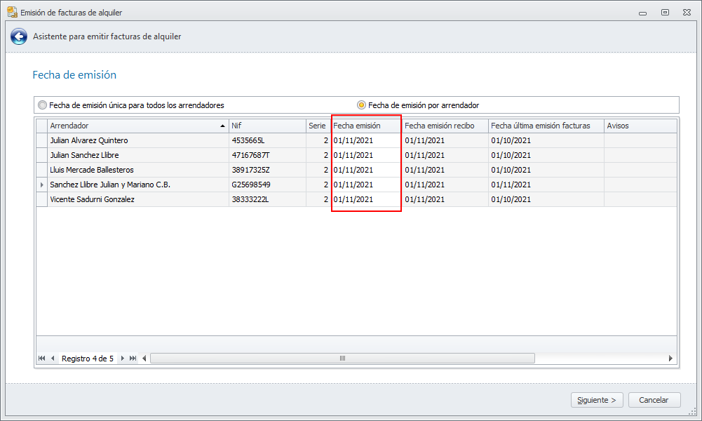 Si activa la casilla Fecha de emisión por arrendador, se muestra la siguiente ventana, pasándose a controlar la fecha de emisión de forma independiente para cada arrendador. El usuario puede cambiar la fecha y asignar, si lo precisa, fechas diferentes para cada arrendador.