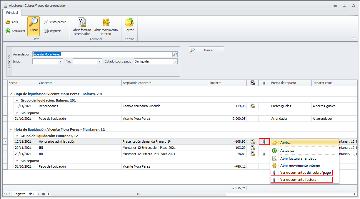 Se ha mejorado el funcionamiento del menú contextual de la vista de cobros pagos del arrendador, para que: