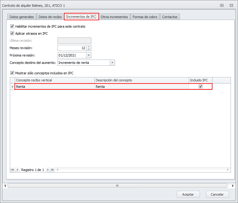 La modificación, afecta tanto al proceso de incrementos de IPC como a la ficha del contrato de alquiler, donde se permite indicar los conceptos sobre los que se aplica el incremento.