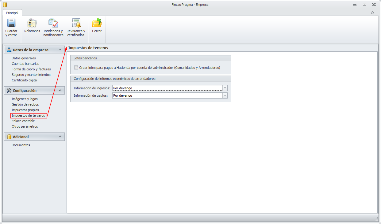 La sección Impuestos de terceros incorpora el cuadro Configuración de informes económicos de arrendadores, con el que se configura la información a mostrar para los ingresos y para los gastos. En ambos casos las opciones disponibles son: Por devengo y Por cobros/pagos.