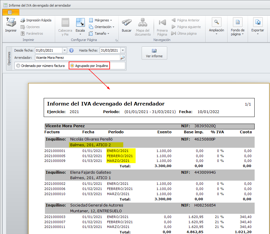 Se ha modificado el Informe de IVA devengado, en su formato Agrupado por inquilino, para incluir la dirección del departamento alquilado y el texto del periodo del recibo. El informe pasa a tener este aspecto.