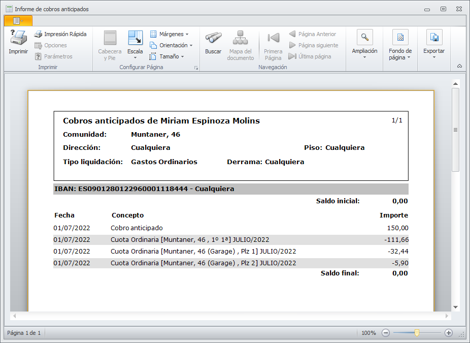 El informe de cobro anticipado de comunidades incluye todos los datos en su cabecera