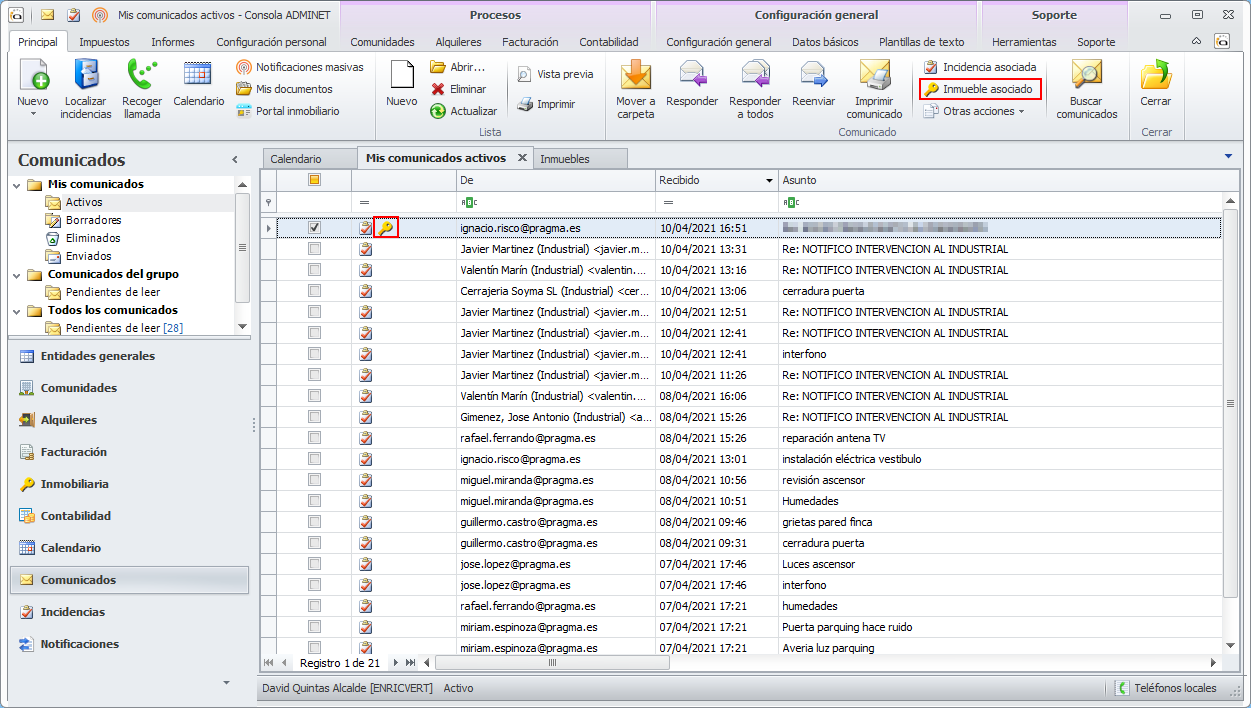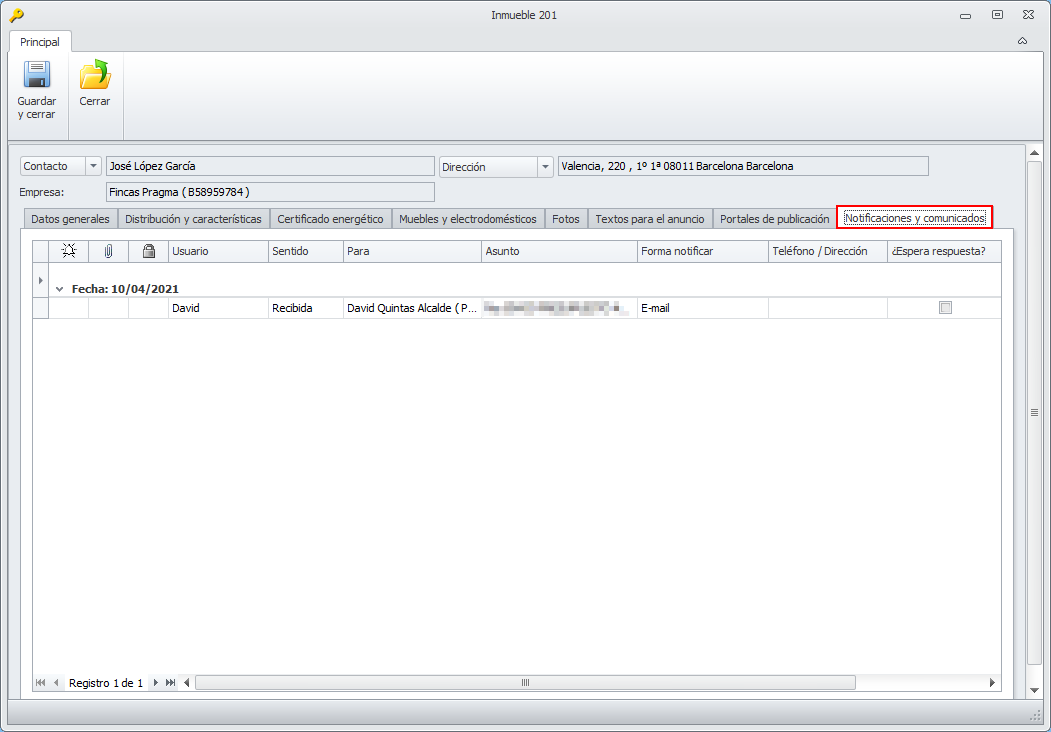 La ficha del inmueble, incorpora una nueva pestaña Notificaciones y comunicados, donde se puede seguir el hilo de las comunicaciones que tiene asociadas.