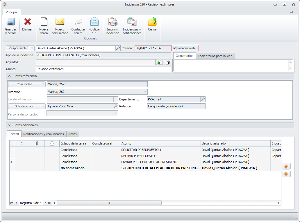 Desde las vistas de comunicados y notificaciones asociada puede accederse a la ficha del inmueble al que está asociada.
