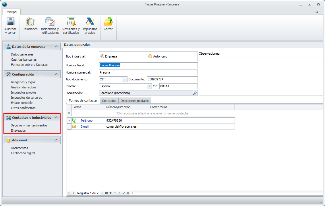 Se han retocado algunas secciones de la ficha de empresa para igualar su lógica a las de comunidades y arrendadores, creando el grupo Contactos e industriales.