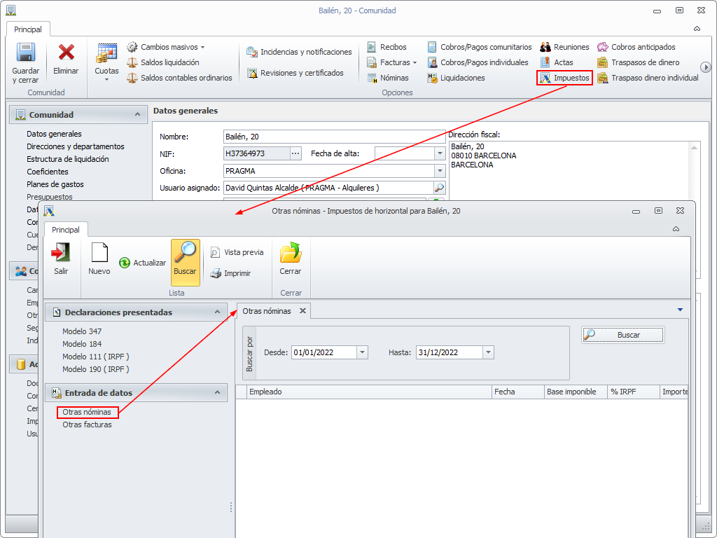 Al disponer de este nuevo proceso, con nóminas generadas y pagadas desde adminet, la sección Nóminas del apartado Impuestos de la ficha de la comunidad se ha renombrado como Otras nóminas, dándole así un nombre y tratamiento similar al de Otras facturas, ya que contiene registros de nómina que no están vinculados directamente a gastos de la comunidad, ni a movimientos de tesorería del administrador.