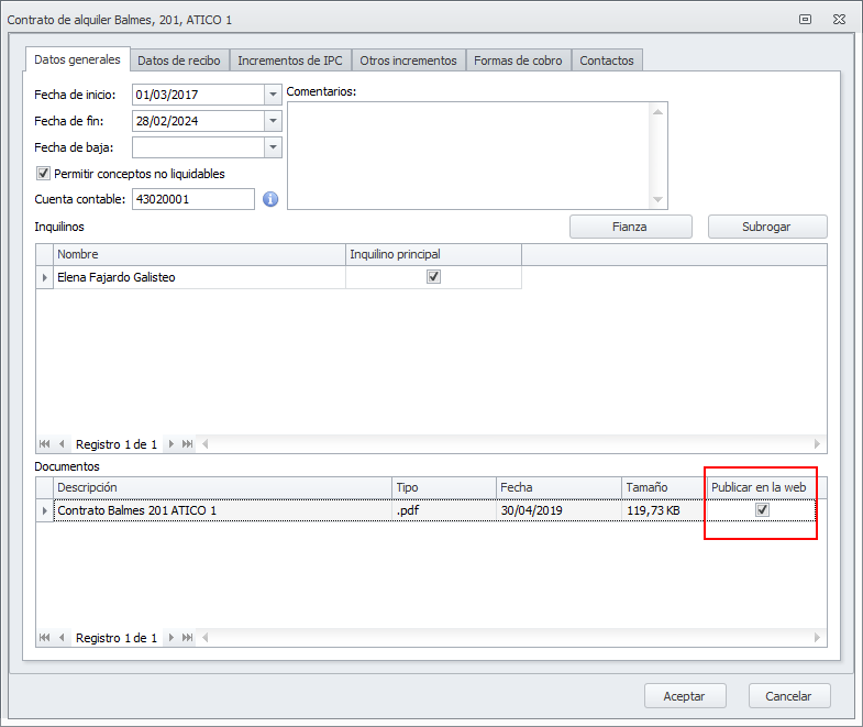 Por defecto, todos los documentos asociados a los contratos de alquiler se publican, siempre y cuando éste tenga activada su publicación. Si no se desea publicar, debe desactivarse al adjuntarlo.