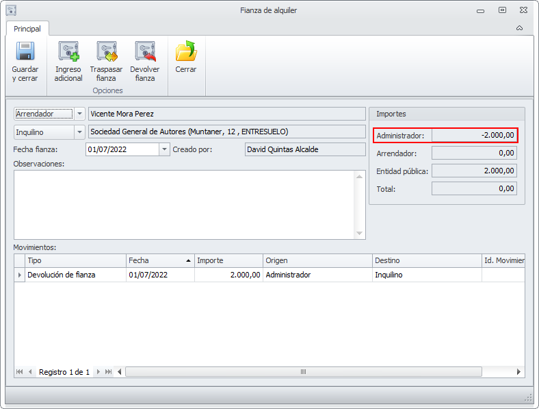 Se permite devolver una fianza al inquilino desde un movimiento de caja del administrador