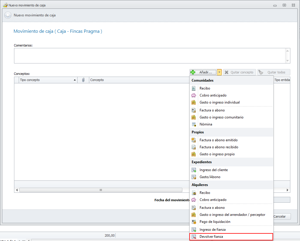 Se ha añadido, a las opciones de movimientos de caja, la de devolver una fianza al inquilino. Hasta ahora, la devolución al inquilino podía hacerse exclusivamente desde movimientos bancarios.