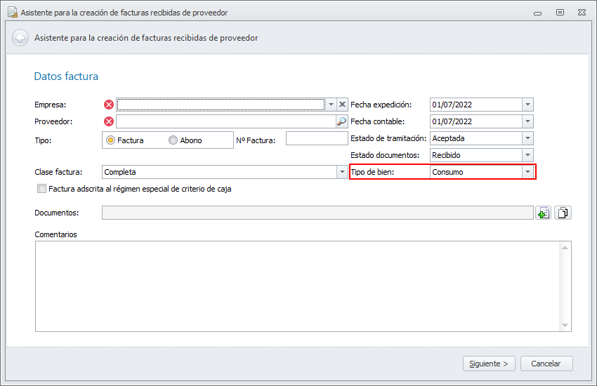 Se ha añadido una nueva casilla en la factura de proveedor que permite indicar si se trata de un bien de consumo o de un bien de inversión. Por defecto se activará la opción de bienes de consumo, por ser los más habituales.