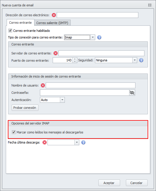 Se ha añadido una casilla en la configuración de la cuenta de correo, visible sólo si el tipo de conexión entrante es IMAP. Esta casilla permite indicar si, tras la descarga de los correos recibidos, estos deben quedar marcados en el servidor de correo como leídos.