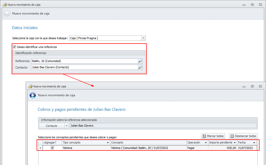 Al iniciar un movimiento de caja localizando la referencia por su nombre, en caso de tratarse de un empleado, se localiza si tiene alguna nómina pendiente de pagar, proponiendo su pago en un primer paso.