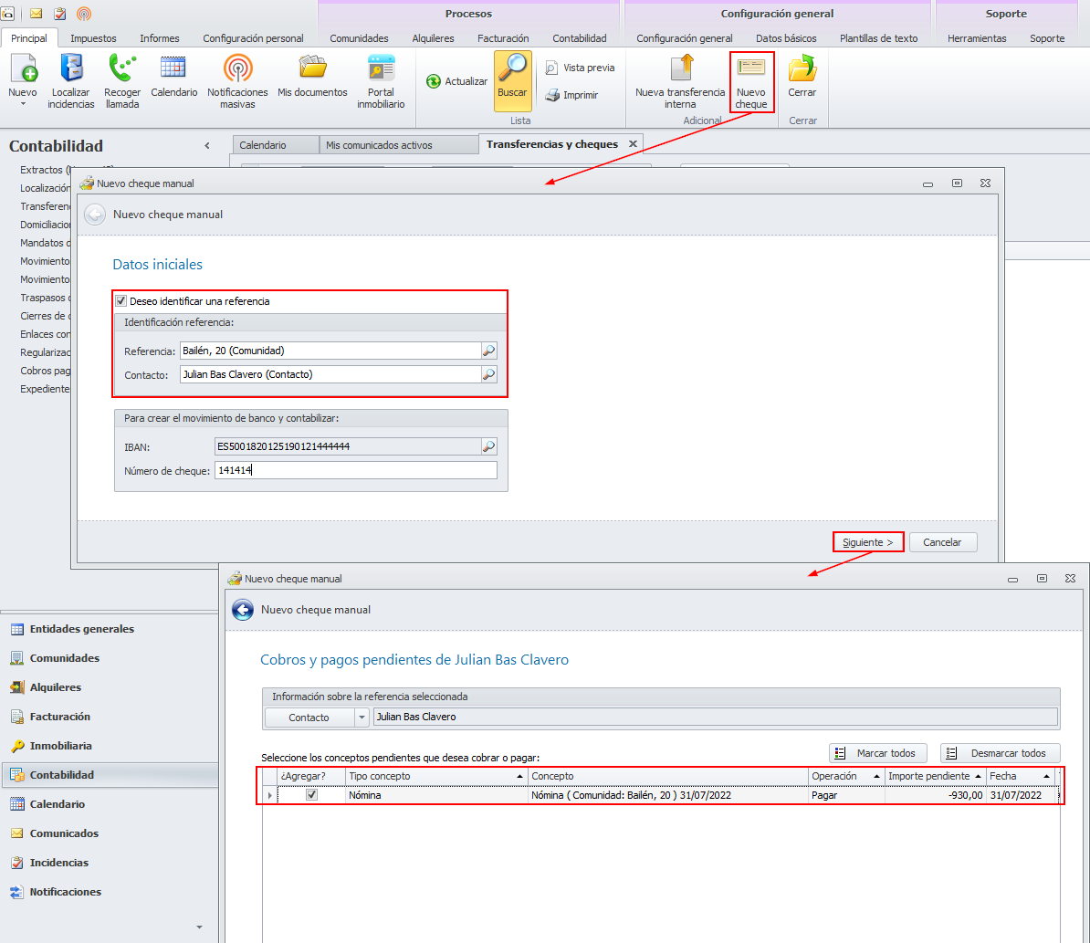 Al iniciar un pago por cheque localizando la referencia por su nombre, en caso de tratarse de un empleado, se localiza si tiene alguna nómina pendiente de pagar, proponiendo su pago en un primer paso.