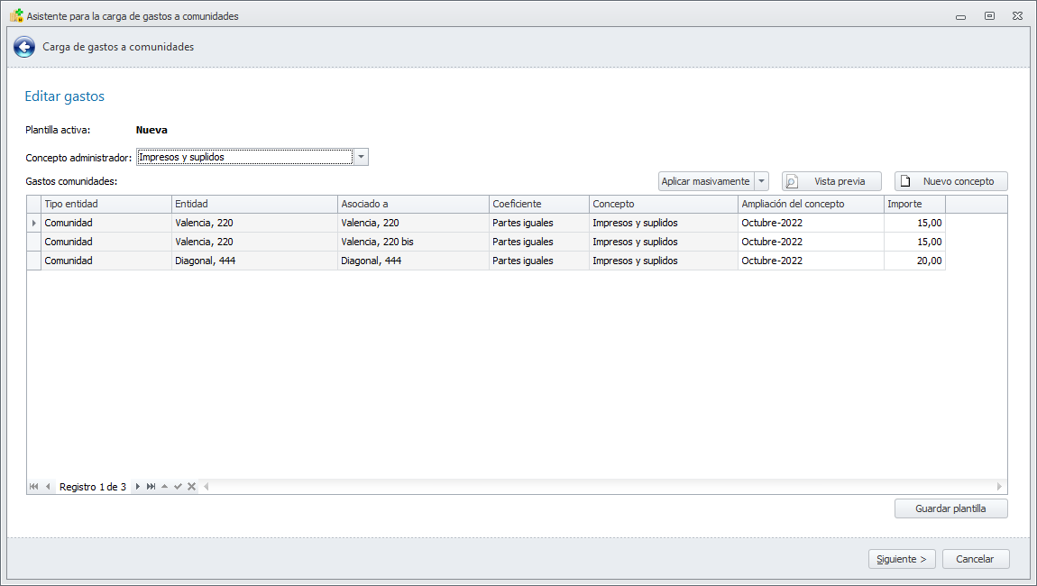 Consiste en una ventana que permite introducir fácilmente una lista de gastos para contabilizarlos en diferentes comunidades, sin la necesidad de hacerlo individualmente. Estos movimientos generados tienen como contrapartida un concepto del administrador. También permite guardar esa lista para recuperarla más delante, modificarla y volverla a añadir.
