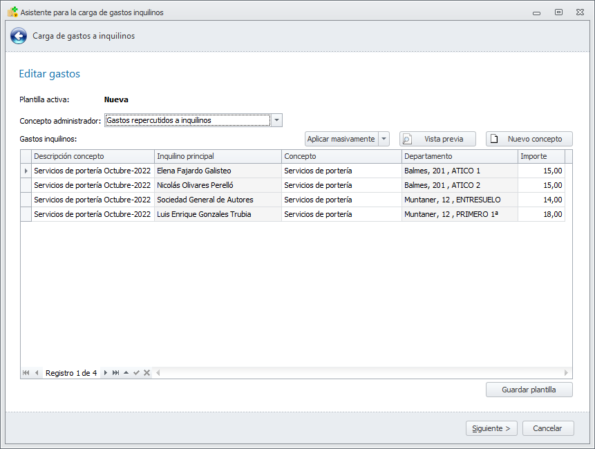 Consiste en una ventana que permite introducir fácilmente una lista de gastos pagados por cuenta de inquilinos para añadírserlos como conceptos de recibo, sin la necesidad de hacerlo individualmente en la ficha de cada contrato de alquiler. También permite guardar esa lista para recuperarla más delante, modificarla y volverla a añadir.