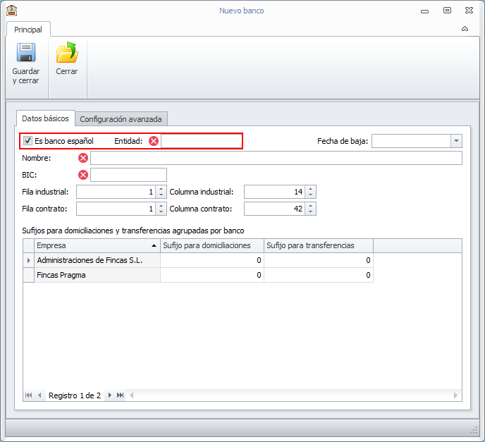 En la versión actual, se añade una casilla con el título Es banco español. En caso de activarse, se requerirá la introducción del código de entidad. Si está desactivada el código de entidad no se solicitará.