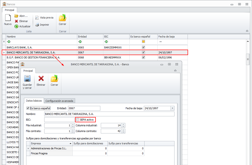 Además, si una entidad bancaria no tiene valor en la casilla BIC, se mostrará a su derecha una casilla SEPA activo, que estará desactivada. Este banco no podrá ser empleado dentro de archivos de normativa SEPA, ya que el BIC es obligatorio. En caso de que el usuario active la casilla SEPA activo, deberá indicar obligatoriamente el BIC de dicha entidad.