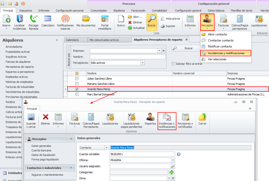 Acceso a “Incidencias y notificaciones” desde la ficha del perceptor de reparto