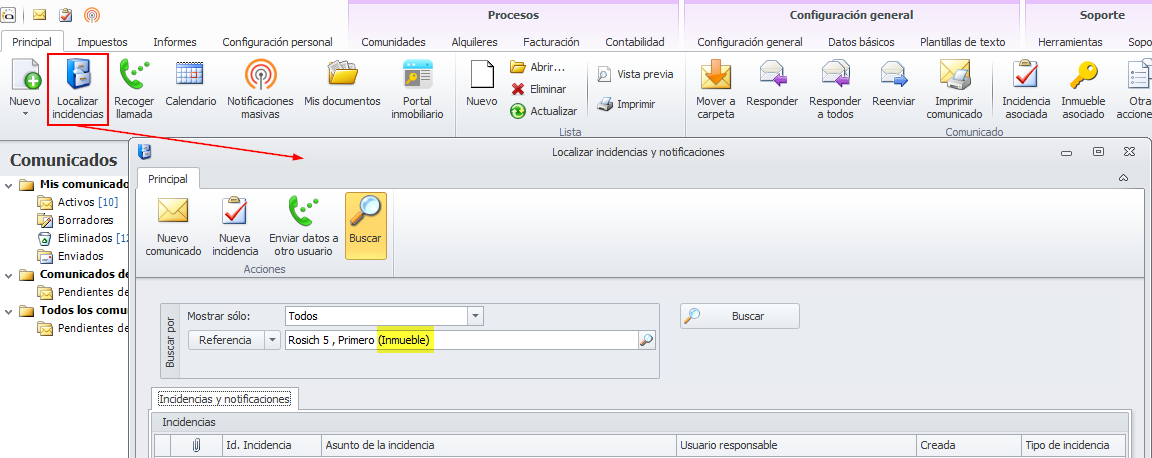 Se amplia la funcionalidad del botón Localizar incidencias para que permita también localizar incidencias y notificaciones relacionadas con un inmueble.