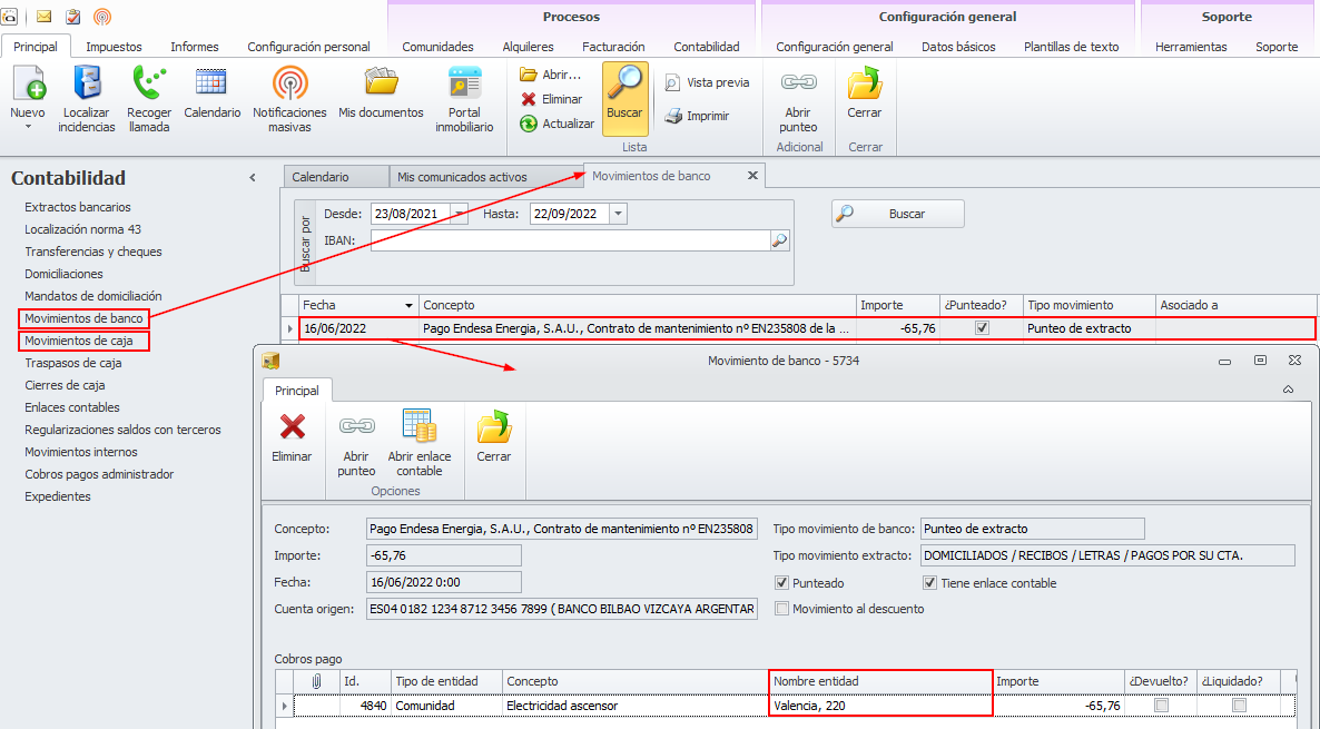 Se ha modificado la ficha de los movimientos de banco y caja para añadir, en el detalle de los cobros y pagos relacionados, el nombre la entidad asociada.
