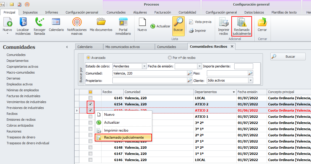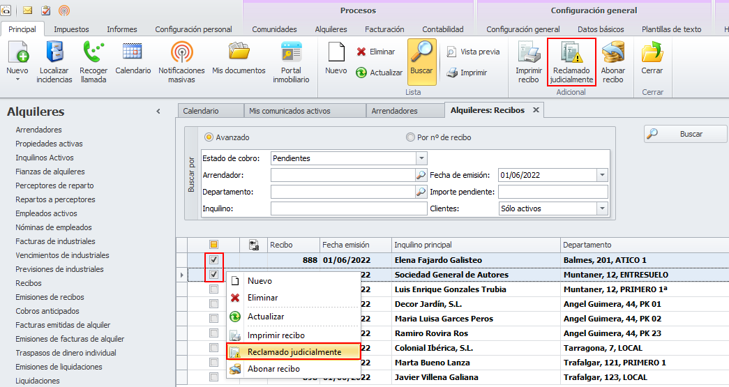 La vista de recibos permite, mediante selección individual o múltiple, marcar recibos como reclamados judicialmente, sin necesidad de editar sus fichas una por una.