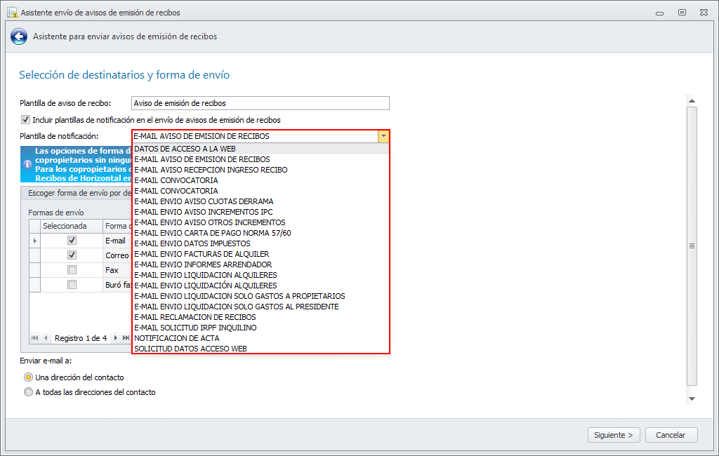 Se han modificado los asistentes de envío de notificaciones para que, al escoger la plantilla de notificación, las muestre por orden alfabético, facilitando así su localización.