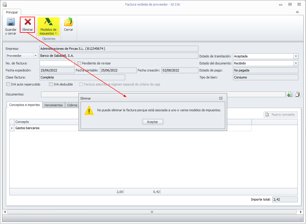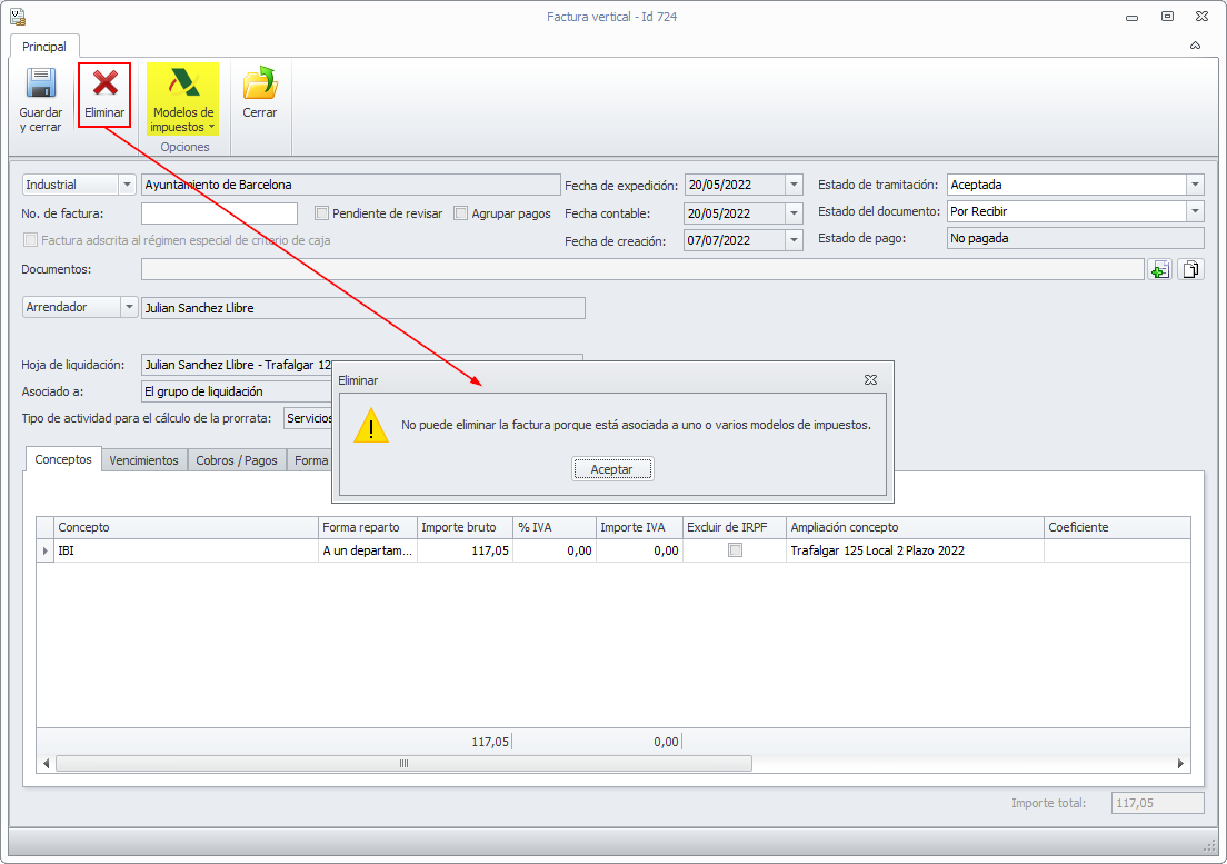 Se impide eliminar una factura de industrial que haya sido incluida en algún modelo de impuestos