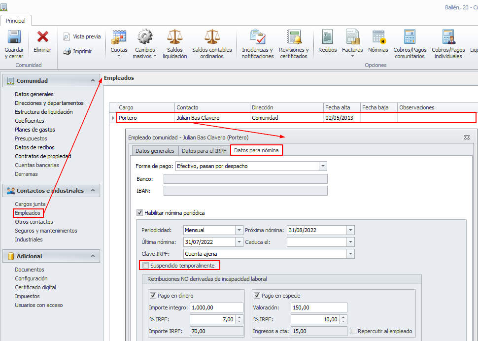 Se añade opción para “suspender temporalmente” la nómina de un empleado de la comunidad