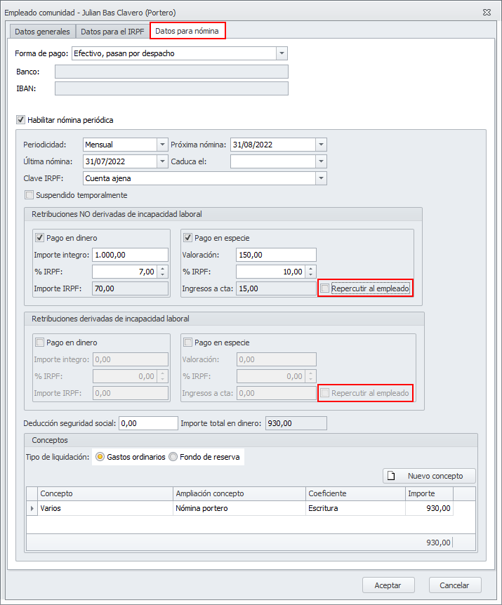 Se ha añadido en la pestaña Datos para nómina de la ficha del empleado dos casillas con el título Repercutir al empleado, vinculadas al importe de Ingresos a cuenta de los pagos en especie.