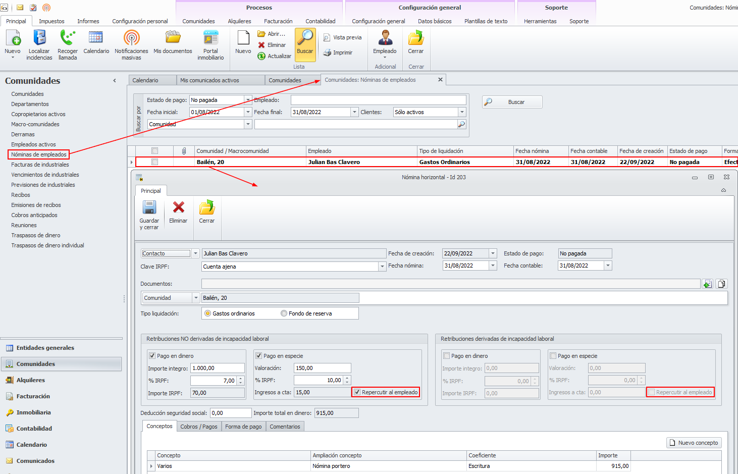 Se ha añadido una nueva casilla en la ficha del empleado de la comunidad con el título Suspendido temporalmente. En caso de activarse esta casilla, el proceso Generar nóminas de comunidades no tendrá en cuenta a este empleado.