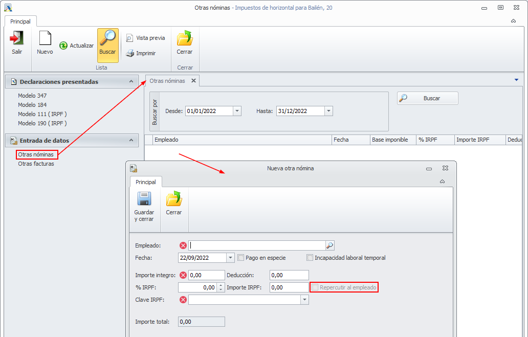 Los importes de los ingresos a cuenta que tengan activada la casilla Repercutir al empleado son acumuladas en la casilla Ingresos a cuenta repercutidos del modelo 190 de la comunidad y del certificado de renta del empleado.