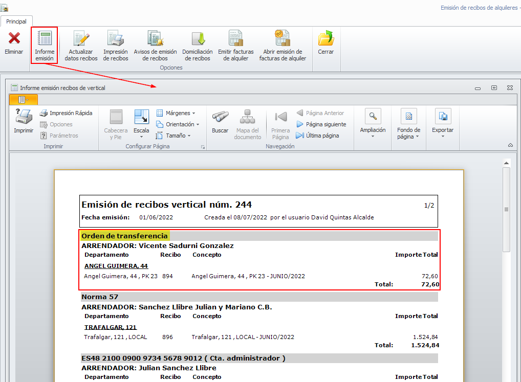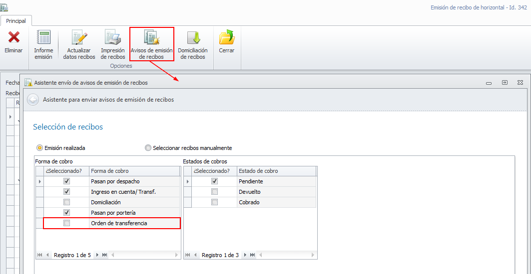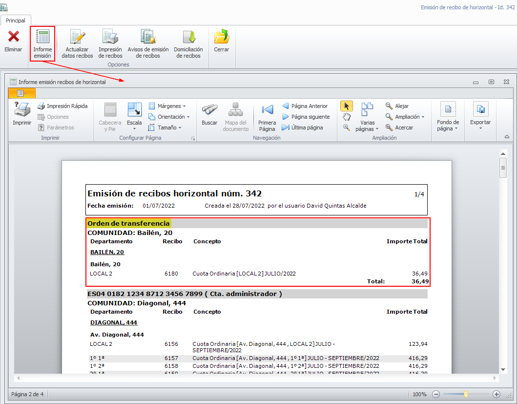 El informe de la emisión de recibos agrupa los recibos que tienen establecida esta forma de cobro.