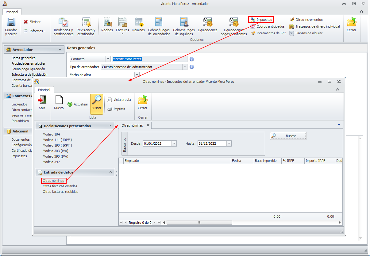 Al disponer de este nuevo proceso, con nóminas generadas y pagadas desde adminet, la sección Nóminas del apartado Impuestos de la ficha del arrendador se ha renombrado como Otras nóminas, dándole así un nombre y tratamiento similar al de Otras facturas, ya que contiene registros de nómina que no están vinculados directamente a gastos del arrendador, ni a movimientos de tesorería del administrador.
