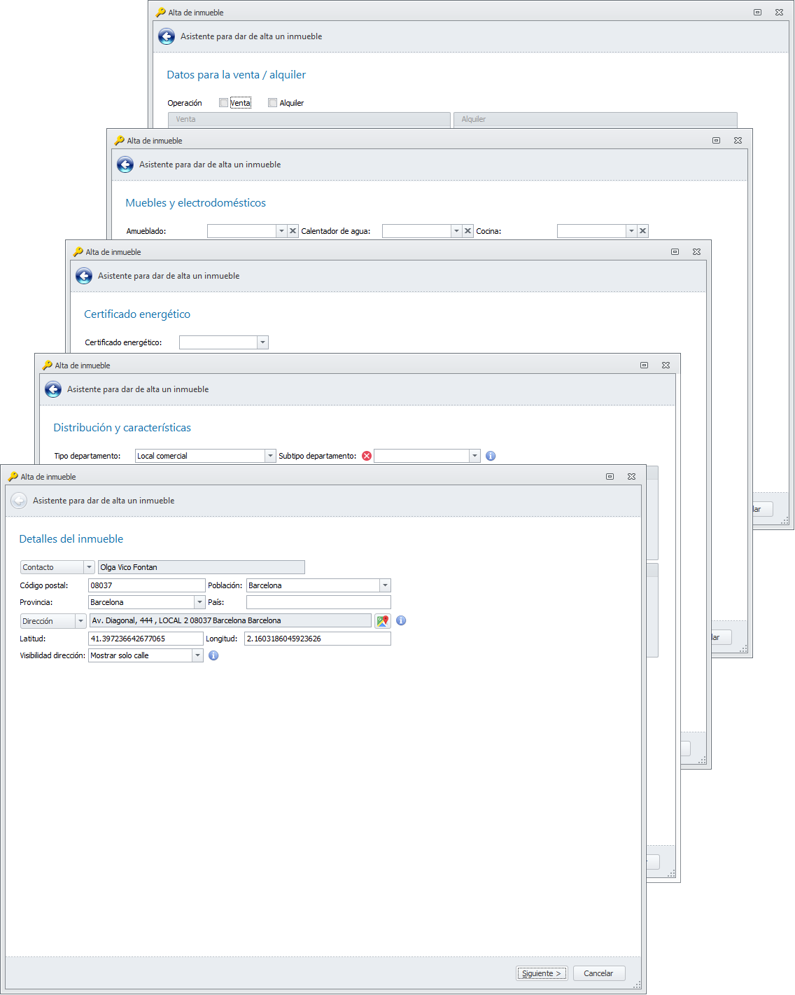 El antiguo asistente se basaba en diversas pestañas de información. Ha sido sustituido por un asistente con diferentes ventanas que ayudan al usuario a no omitir ninguna información referida al inmueble.