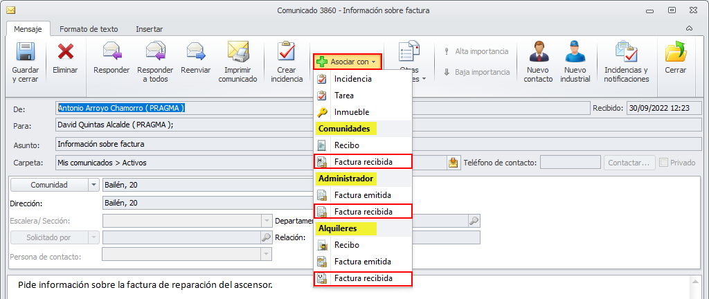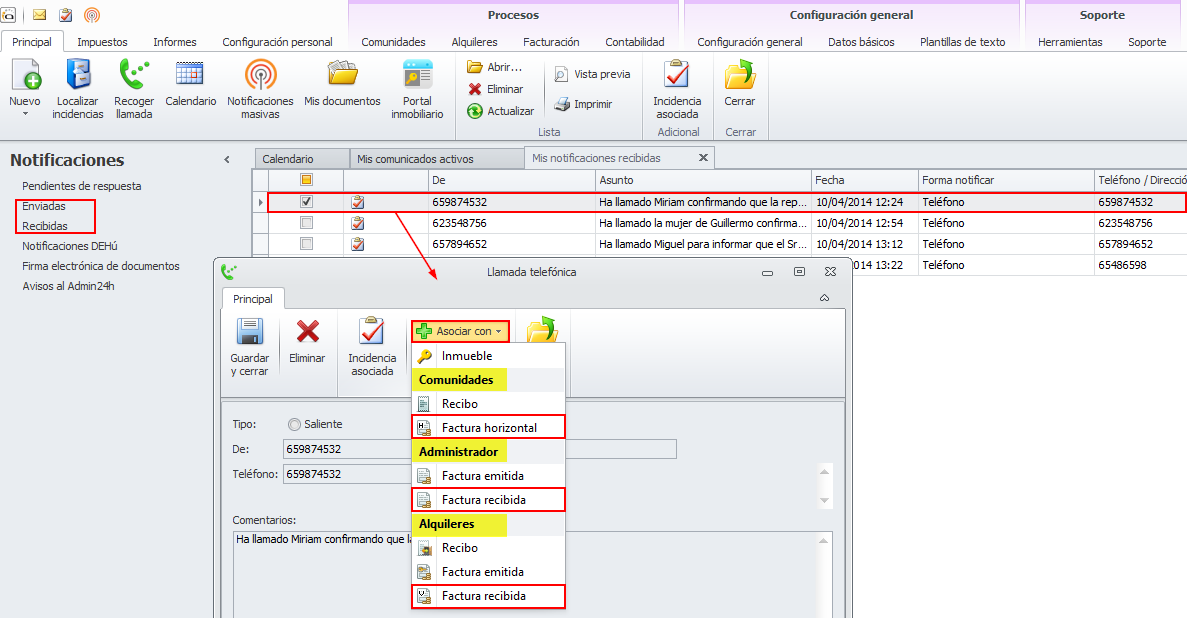 En la ficha de las notificaciones enviadas y recibidas se añade la posibilidad de asociarlas a facturas recibidas de comunidades, alquileres y administrador.