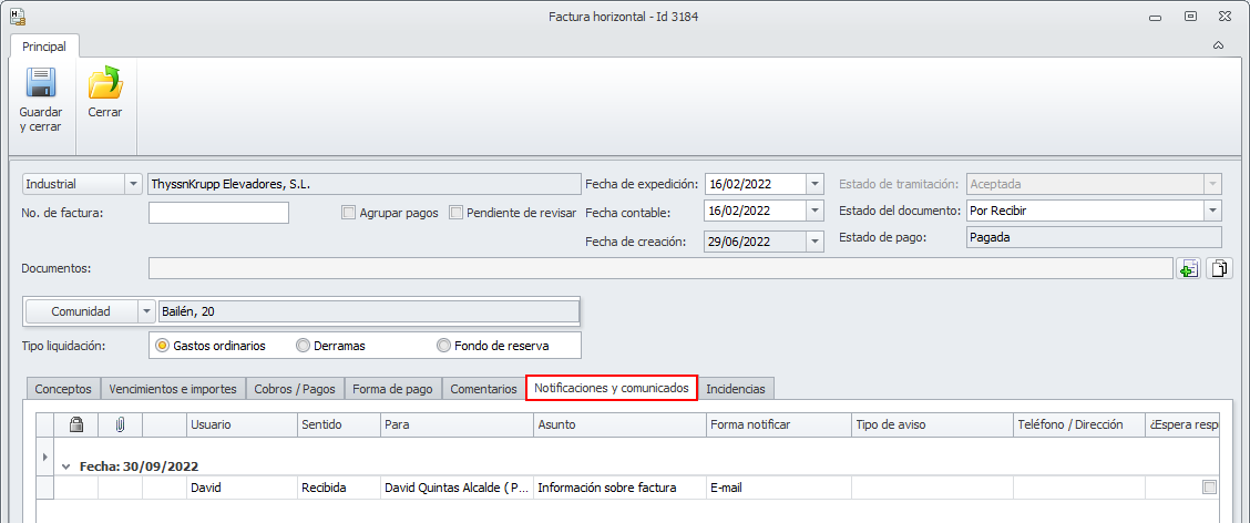 Además, incorpora también una pestaña Notificaciones y comunicados, que muestra una lista con las notificaciones y comunicados en los que está vinculada esta factura.