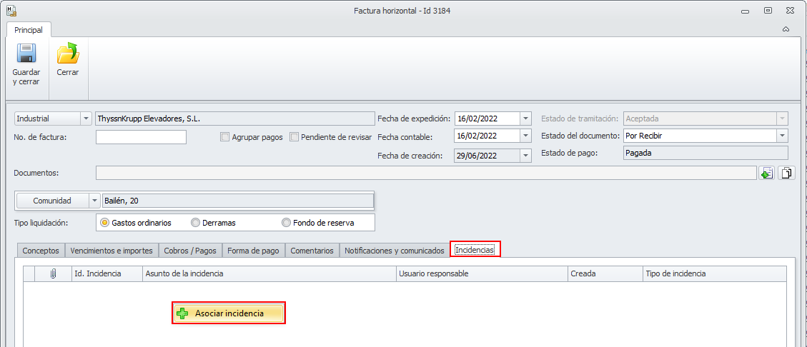 Las fichas de facturas de industriales de comunidades y arrendadores y las de proveedores del administrador, incorporan una pestaña Incidencias, que muestra las incidencias en las que está asociada esa factura, permitiendo asociarla a más incidencias.