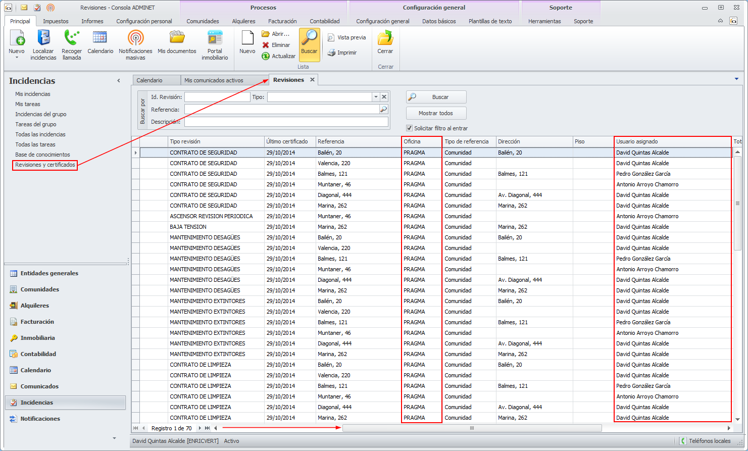 Se ha modificado la vista de Revisiones y certificados para añadir dos nuevas columnas con la Oficina y el Usuario asignado.