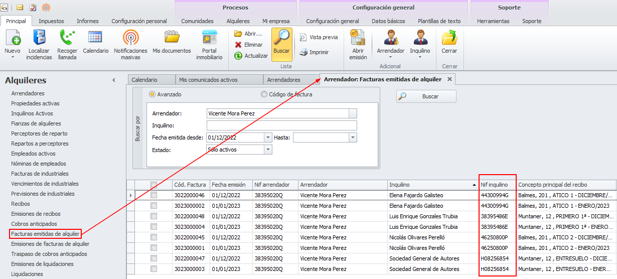 Se añade NIF del inquilino en la vista de facturas emitidas del arrendador