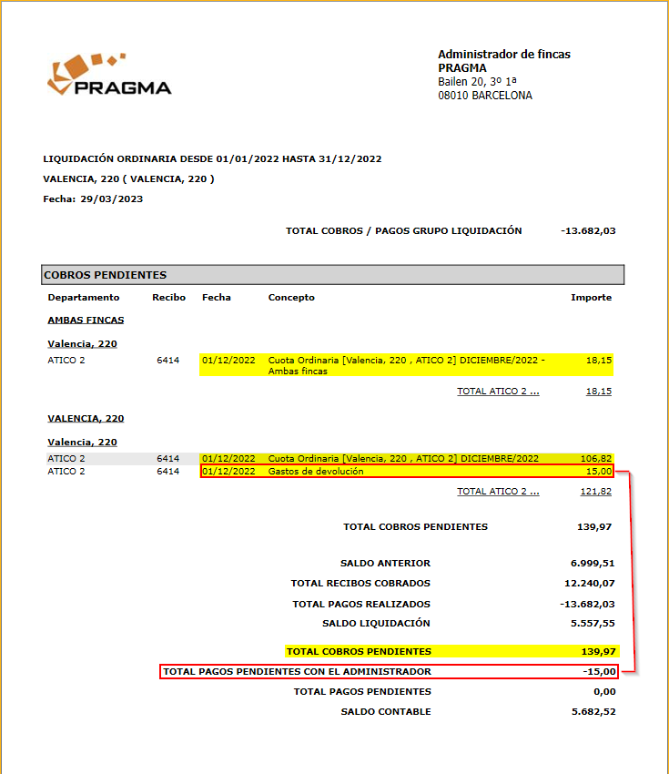 En la siguiente imagen puede ver como el Total cobros pendientes incluye la totalidad de los conceptos de los recibos, incluyendo gastos de emisión y devolución. Inmediatamente después, Total pagos pendientes con el administrador muestra, en negativo, la suma de los gastos de emisión y devolución. De este modo, el saldo contable es el resultado de: Saldo liquidación + Total cobros pendientes - Total pagos pendientes con el administrador - Total pagos pendientes.