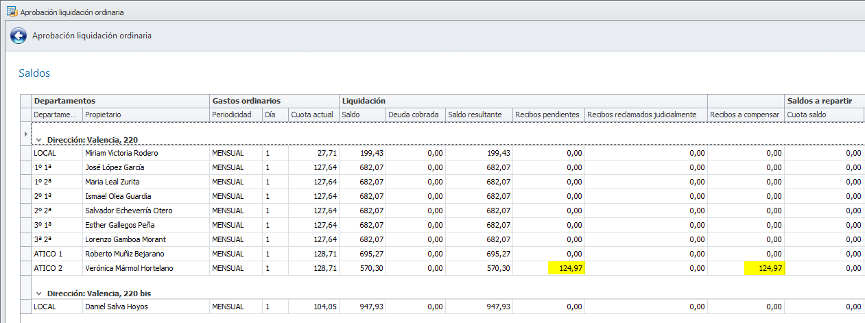 Para la liquidación del punto anterior, esta sería la ventana de aprobación de liquidación, en la que se puede ver cómo sólo compensará 124,97€ (18,15 + 106,82) y no los 139,97 del total pendiente.
