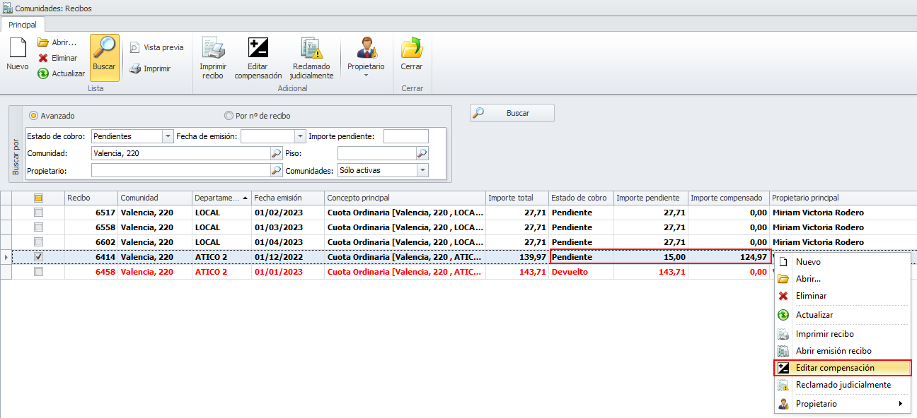 A partir de ahora, si el administrador decide compensar también estos gastos de emisión y/o devolución, debe hacer lo desde la vista de recibos pendientes.