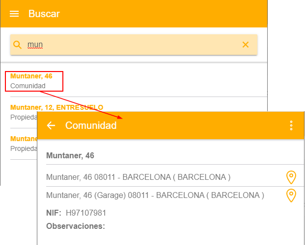 Tras la búsqueda de la referencia, al pulsar sobre uno de los resultados se muestra la ficha de esa referencia, con su NIF, direcciones y observaciones. Éste, es un ejemplo de una comunidad de propietarios.